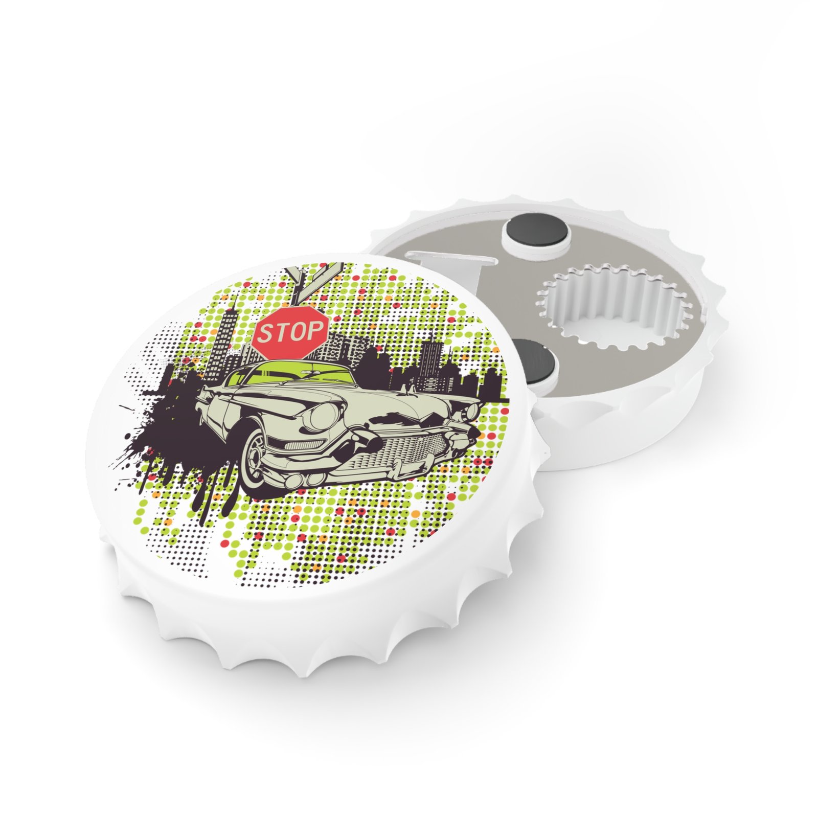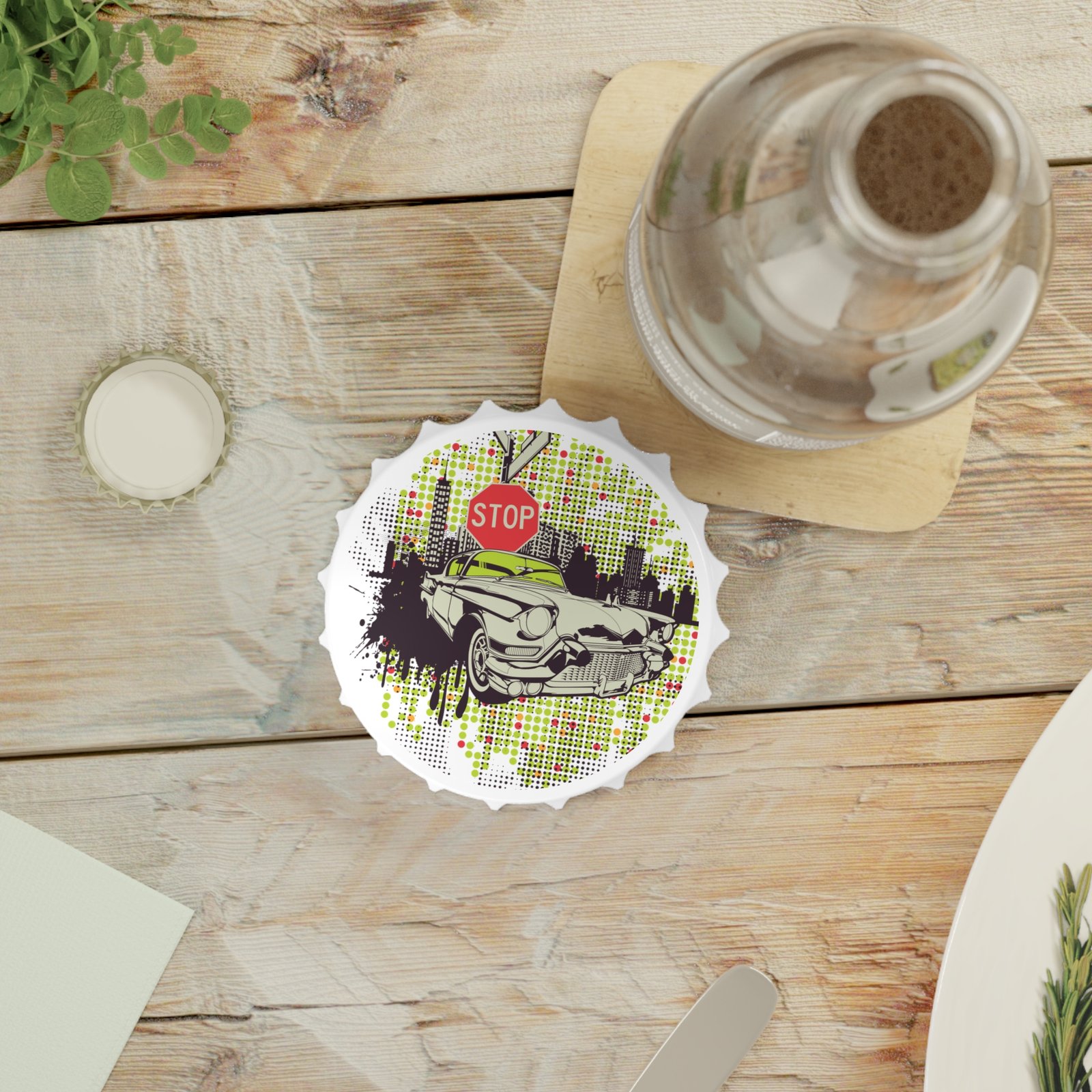 This automotive themed bottle opener is a must-have for car enthusiasts. With a bottle cap featuring a stop sign and a car, it adds a touch of automotive flair to your drinking experience. Made from durable materials, this bottle opener is not only stylish but also functional. It’s the perfect accessory for parties, gatherings, or simply enjoying a cold beverage after a long drive. Get ready to pop open your favorite drinks with this unique and eye-catching bottle opener.